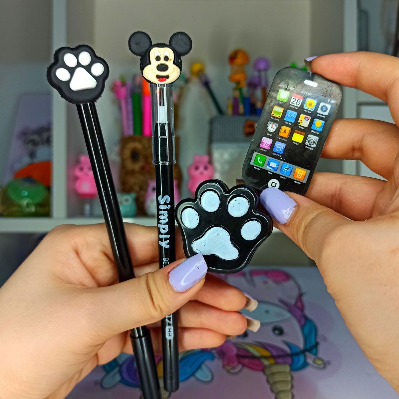ست مشکی لوازم تحریر شامل: روان نویس پنجه، مداد فشنگی میکی موس، مداد تراش پنجه، پاک کن آیفون کوچک